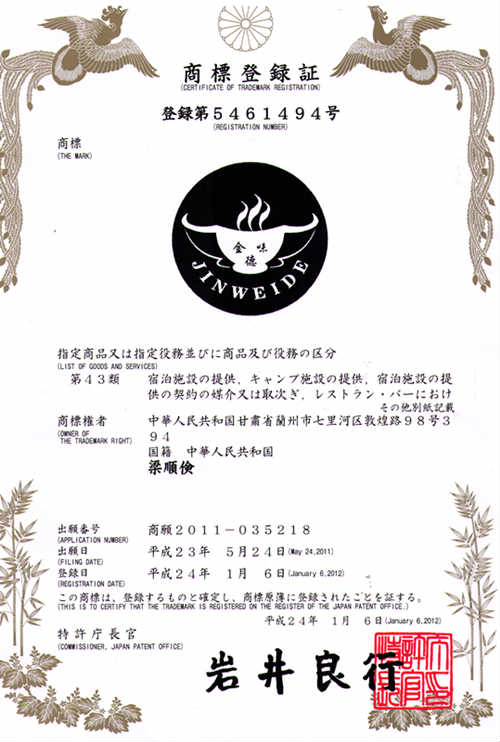 2012年1月6日,甘肅金味餐飲有限公司旗下“金味德”品牌商標在日本特許廳的認證后,正式獲得在日本的商標使用權。