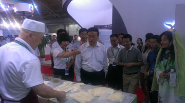 以上數圖為公司總經理梁順儉陪同蘭州市市長袁占亭,蘭州市食藥局局長楊繼良及其他各級領導在北京國際會展中心視察金味德蘭州牛肉拉面展臺。