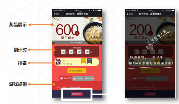 舉例說明,這是一起霸王餐助力分享活動。我們的獎品是600塊的代金券,這個金額對于消費者來說還是有一定的吸引力。同時我們要設定合理的規則,讓他認為自己有可能得到這張代金券,他才會參與。根據我們以往的活動經驗,一般活動前三名能給餐廳帶來50%以上的活動效果。怎么做?我們要通過短信、微信實時告訴他票數的情況,還有20票你就可以超過了,你是不是應該努力了。對第二名說,還差20票就可以超過第一名,你應該加油。還有另外一家麻辣鍋新開店的活動,我們對第一名設置400塊錢的代金券,第二名200塊錢代金券,第三名100塊代金券。整體的營銷成本大概是700塊錢,這一期活動結束以后,新增粉絲3524,人力成本是0.2元。