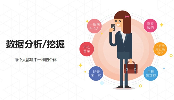 我們說了那么多活動,我們的會員積累、會員維護,最終目的都是想通過消費者的消費行為對消費者進行畫像。大家都知道每個人都有他獨特的口味。有些人喜歡吃辣,有些人喜歡吃酸,每個人都有不同的消費體驗。得到這些數據之后,就可以對消費者進行分類。分類的目的是為了更好的精準營銷,為營銷做決策。忠誠會員,肯定是要提升客單價,因為他對你的口味是非常熟悉的。在最合適的時間選擇最酷的呈現方式,送上他最愛吃的美食。