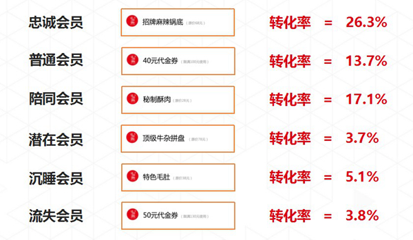 接下來,我們講一下精準營銷和普通營銷的區別。這是我們火鍋店的一個客戶,第一期的時候我們統一對所有的用戶發放50塊錢的代金券,票券的核銷率大概是3.64%,這是一個平均值。第二次我們進行整理,他有8907個會員,忠誠會員946個,普通會員1191個,通過他們的消費行為數據分析,針對忠誠會員,我們給他發代金券,轉化率達到26.3%。對于只在店里有過一次消費記錄的普通會員和流失會員,我們對他的判斷不是非常精準,用統一的代金券進行營銷。因為流失會員挽留成本更大,所以代金券使用的是50塊錢。陪同會員,陪朋友去吃過,但是沒有買過單。這時候可以把店里的特色菜推送給他。沉睡會員,以前經常在這里吃飯的,隔了很久一段時間沒有來,什么原因?是吃膩了還是我們沒有新品?這個時候可以把新品推送給沉睡會員,最后轉化率達到5.1%;顒咏Y束后,我們的卡面核銷率達到9.34%,比我們對所有的顧客發送一樣代金券的時候提升了5.7%,當前的營業收入大概是132975元,當月的整體營業額是128萬。