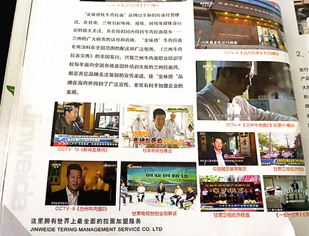 “金味德牦牛肉拉面”品牌以全新的拉面經(jīng)營(yíng)模式、、在甘肅、蘭州引起電視、報(bào)紙、網(wǎng)絡(luò)等媒體及行業(yè)的極大關(guān)注,并在短時(shí)間內(nèi)得到牛肉拉面故鄉(xiāng)——蘭州的廣大顧客的認(rèn)可和追捧。“金味德”牛肉拉面專(zhuān)用湯料在全國(guó)的配送和廣泛使用,《蘭州牛肉拉面寶典》的全國(guó)發(fā)行,興隴蘭州牛肉面職業(yè)培訓(xùn)學(xué)校每年面向全國(guó)各地及國(guó)外培訓(xùn)大批的蘭州拉面師,都是其它品牌無(wú)法復(fù)制的宣傳渠道,使“金味德”品牌在海內(nèi)外得到了廣泛的宣傳,非常有利于加盟企業(yè)的發(fā)展。