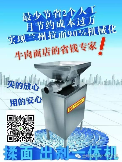 這臺機器采用304不銹鋼一次鑄造而成,制造工藝精細,結實耐用,好清洗、易操作,是解放揉面師、和面師的一款神器,大大降低了開店成本,使從事蘭州拉面工作變得更加輕松,這也標志著蘭州拉面向高科技延伸邁出了一大步。