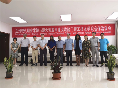 蘭州現(xiàn)代職業(yè)學(xué)院領(lǐng)導(dǎo)與澳大利亞本迪戈坎陪門理工技術(shù)學(xué)院代表團(tuán)合影。