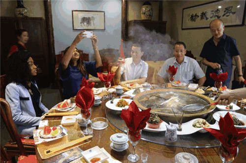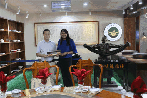 代表團(tuán)在中國(guó)蘭州牛肉拉面體驗(yàn)工坊對(duì)牛肉面始祖“熱鍋?zhàn)用妗边M(jìn)行了解。