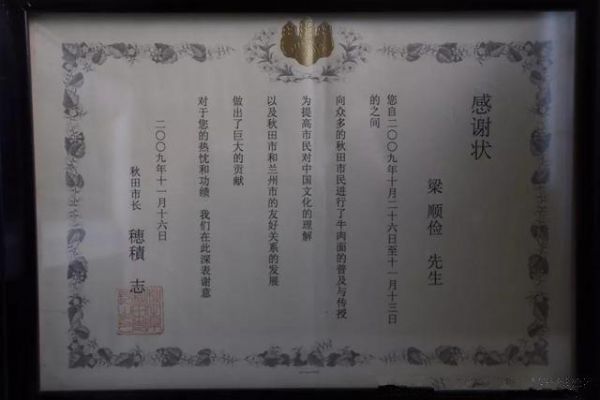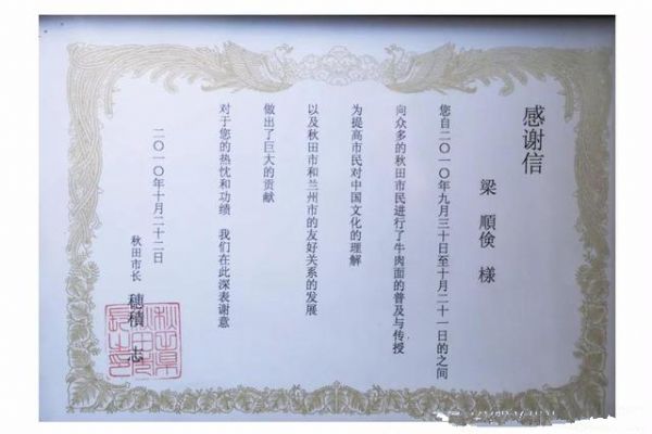 2009、2010年兩年,梁順儉先生代表中國-蘭州作為蘭州牛肉面文化交流大使赴日本秋田進行蘭州牛肉拉面文化技術交流,推動蘭州牛肉拉面文化的國際化發展。