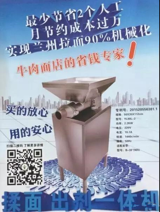 近年來,蘭州牛肉面產業化發展被提上了日程,備受矚目。然而,產業化發展,必須實現機械化。正當牛肉面人為之發愁的時候,興隴牛肉拉面廚房設備有限公司率先邁出了第一步,研究發明出了“興隴”揉面出劑一體機,這是蘭州拉面史上一次全新的嘗試與改革,將極大推動蘭州牛肉面的發展。
