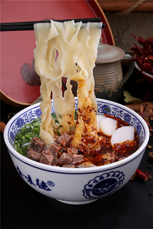 面寬約10mm左右,又稱“皮帶”,一般三手成型。柔韌結(jié)實(shí),口感筋勁,面與湯,滋味分明。食面如是肉,大快朵頤。