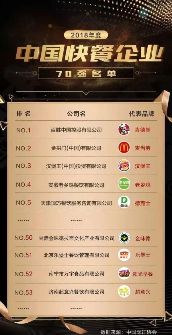 10月11日,中國快餐產(chǎn)業(yè)大會于大連召開,中國烹飪協(xié)會在會上頒布了“2018年度中國快餐70強榜單”。這個榜單的Top 3是再熟悉不過的面孔:肯德基(百勝中國,旗下還有必勝客等)、麥當(dāng)勞(金拱門)、漢堡王。