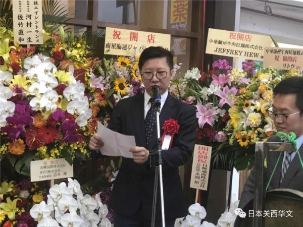 當天,包括中華蘭州拉面株式會社社長康主恩,甘肅省商務廳特派專員、蘭州牛肉拉面國際聯盟主席梁順儉,國際飲食養生研究會副會長侯同明,日神通商株式會社社長田國輝,以及中國駐大阪總領館商務室負責人孫淑強、日中經貿中心常務理事池田稔兩位重要嘉賓齊聚現場,共同參加了神戶首家“中華蘭州牛肉拉面”的開業慶典。日本《關西華文時報》總編輯叢中笑也應邀參加了儀式。