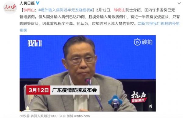 就在今天,鐘南山院士在廣東省疫情防控例行新聞發(fā)布會(huì)再一次強(qiáng)調(diào):國(guó)外輸入病例一半沒(méi)有發(fā)燒癥狀,只有咳嗽等癥狀,因此重視程度不高。他認(rèn)為,應(yīng)該加強(qiáng)對(duì)入境人員的管控。