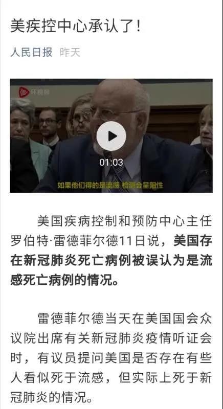 3月12日,@人民日報公眾號發(fā)表了《美疾控中心承認了!》一文。