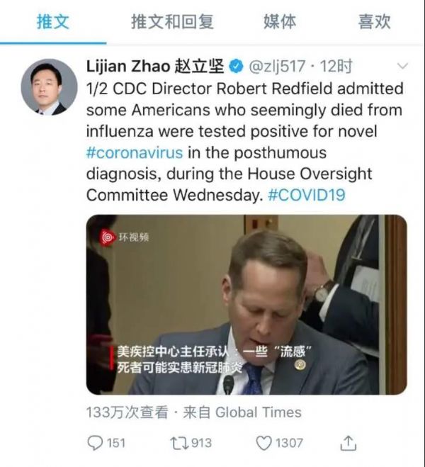 同日,外交部發(fā)言人趙立堅在推特上發(fā)文,對美國疾控中心主任承認美國有流感死者可能實患新冠肺炎一事進行了評論。