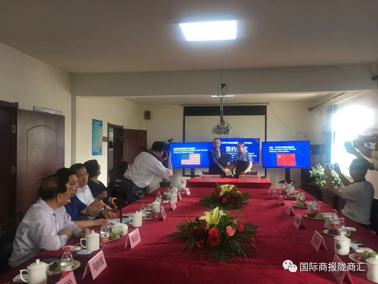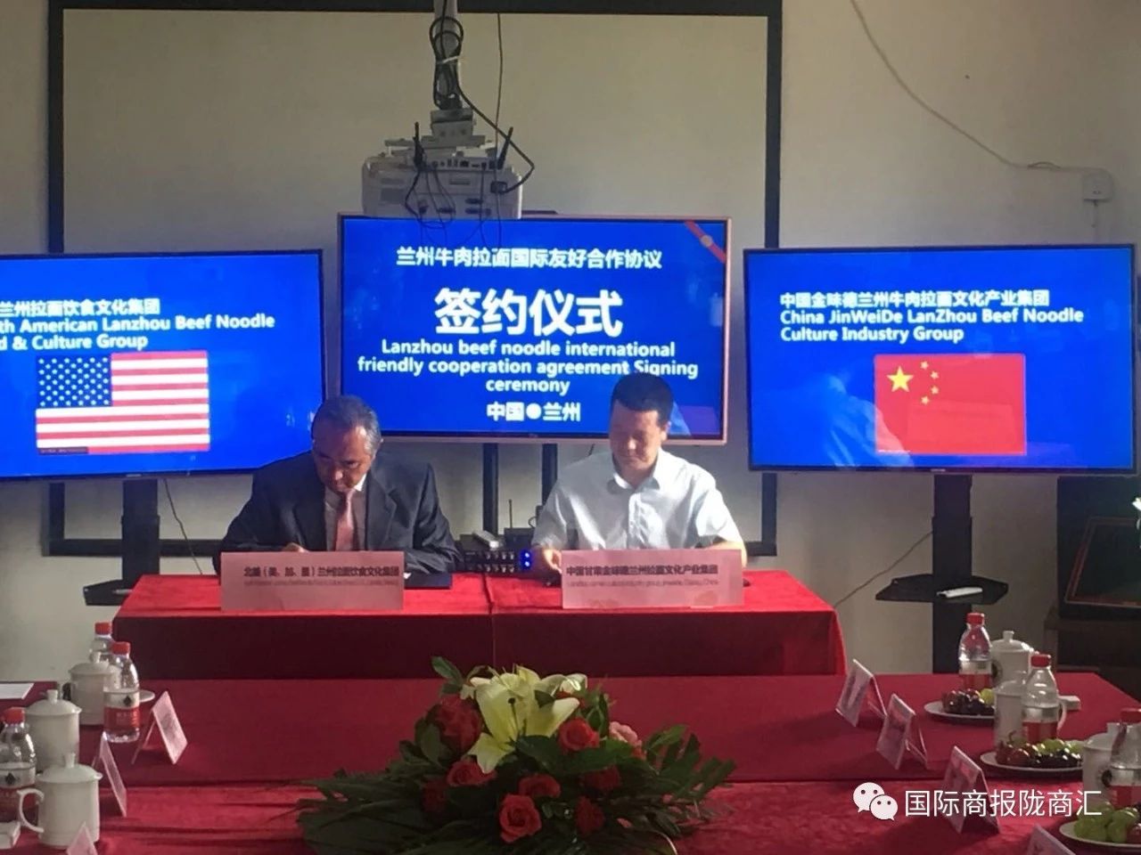 6月24日,參加2018中國面條博覽會的數十位中外嘉賓在甘肅省商務廳、甘肅省人社廳、甘肅省外事辦有關領導陪同下,前往蘭州金味德拉面公司下屬企業、培訓學校參觀交流。當日上午,美國南加州華人華僑商會會長、北美蘭州拉面餐飲文化集團董事長應持榮同蘭州牛肉拉面協會會長馬利明簽訂戰略合作協議;同蘭州金味德牛肉面文化產業集團董事長梁順儉簽訂意向性合作協議。