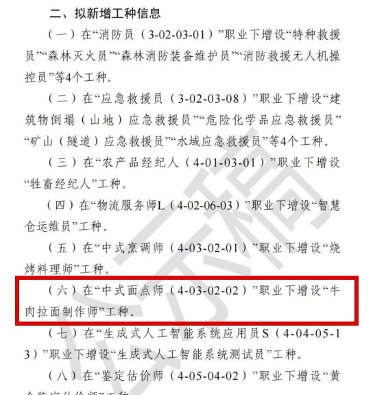 5 月 8 日,人力資源和社會保障部公示擬發(fā)布的新職業(yè)、新工種信息,“牛肉拉面制作師” 赫然在列。作為國家級非遺文化技藝美食的代表,蘭州牛肉拉面早已走向世界,帶動就業(yè)人口超過 150 萬人,在甘肅省人社廳、蘭州市人社局、行業(yè)協(xié)會、企業(yè)等共同推動下,成功申報國家新工種,成為職業(yè)產(chǎn)業(yè)化促進農(nóng)業(yè)、牧業(yè)、就業(yè)、創(chuàng)業(yè)、文旅產(chǎn)業(yè)等經(jīng)濟發(fā)展的典范 。